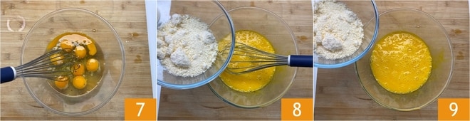 Schlagen Sie die Eier mit einem Schneebesen 7, dann fügen Sie den geriebenen Parmigiano Reggiano DOP 8 und den geriebenen Pecorino 9 hinzu.