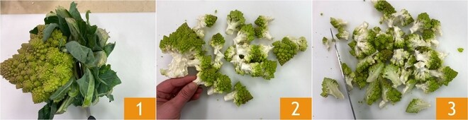 Um den lauwarmen Reissalat mit drei Brokkoli zuzubereiten, säubern und schneiden Sie zuerst die Brokkoli: Entfernen Sie den Strunk und die Blätter des Romanesco-Brokkolis 1, dann trennen Sie die Röschen 2, indem Sie die größeren in kleinere Stücke schneiden 3.