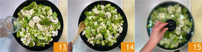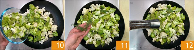 Fügen Sie auch den Romanesco-Brokkoli 10, die Thymianzweige 11, Salz und Pfeffer 12 hinzu.