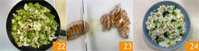 Nach den 20 Minuten Kochzeit der Brokkoli, nehmen Sie den Deckel ab und entfernen die Knoblauchzehen, dann erhöhen Sie die Hitze und braten die Brokkoli kurz an, um sie goldbraun zu machen; es ist besser, nicht umzurühren, sondern die Pfanne nur zu schwenken 22. Schneiden Sie nun die Hähnchenbrust in Scheiben und fügen Sie sie dem Reis hinzu, den Sie mit den Brokkoli gemischt haben 23. Ihr lauwarmer Reissalat mit drei Brokkoli ist bereit zum Genießen 24!