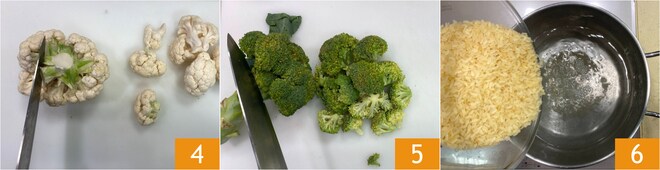 Machen Sie dasselbe mit dem Blumenkohl 4 und dem Brokkoli 5. In der Zwischenzeit bringen Sie einen Topf mit Salzwasser zum Kochen und kochen den Reis nach der auf der Packung angegebenen Zeit 6.