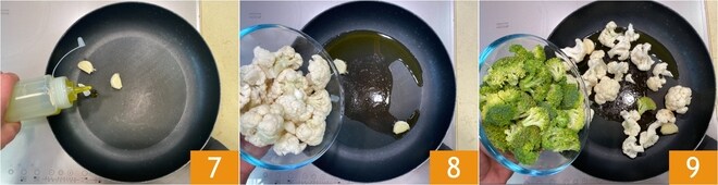 Geben Sie einen Schuss Öl in eine große Pfanne und lassen Sie es mit 2 Knoblauchzehen aromatisieren 7, dann fügen Sie den Blumenkohl 8 und den Brokkoli 9 hinzu.