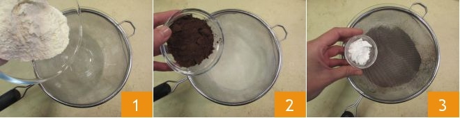 Um die gingerbread bundt cake zuzubereiten, schmelzen Sie zuerst die Zartbitterschokolade in der Mikrowelle oder im Wasserbad und lassen Sie sie dann abkühlen. In einer großen Schüssel das Mehl 1, den Kakao 2 und das Backpulver sieben.