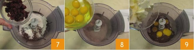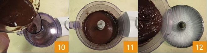 Während der Mixer läuft, den geschmolzenen Schokolade langsam zugeben 10. Sobald eine homogene Mischung erreicht ist, die Klingen stoppen 11. Eine Gugelhupfform mit einem Durchmesser von 24 cm einfetten und mehlieren, den Teig hier einfüllen 12.