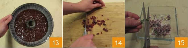 Den Kranzkuchen im vorgeheizten statischen Ofen bei 180° für 40 Minuten backen 13. In der Zwischenzeit 30 g getrocknete Cranberries hacken 14, die Cranberries mit 2 Esslöffeln Kristallzucker und 2 Esslöffeln braunem Zucker würzen, auch einige Rosmarinnadeln in Stücke geschnitten hinzufügen 15. Beiseite stellen, es wird zur Dekoration des Kuchens benötigt.