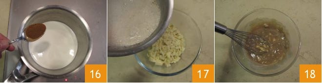 In einem kleinen Topf die Sahne mit einem Teelöffel Zimt 16 erhitzen und dann heiß über die gehackte weiße Schokolade gießen 17, mit einem Schneebesen umrühren, um die Schokolade zu schmelzen 18 und eine glatte und homogene Sauce zu erhalten.