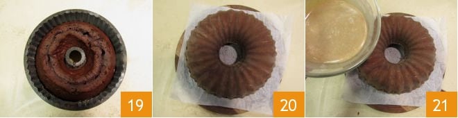 Inzwischen wird der Kranzkuchen fertig sein, aus dem Ofen nehmen 19, abkühlen lassen und dann auf einem mit Backpapier ausgelegten Schneidebrett oder einer Platte stürzen 20. Die weiße Schokoladenglasur über den Kuchen gießen 21.