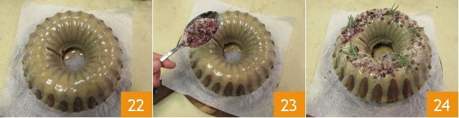 Die Oberfläche muss vollständig bedeckt werden 22, sofort mit den gezuckerten Cranberries garnieren 23. Die gingerbread bundt cake ist bereit, genossen zu werden 24.