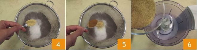 Würzen Sie die trockenen Zutaten mit gemahlenem Ingwer, gemahlenem Zimt 5 und einer Prise Muskatnuss. Geben Sie in die Schüssel des Mixers den braunen Zucker 6.