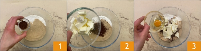 Um Ihren Lebkuchen-Kuchen vorzubereiten, beginnen Sie mit dem Mürbeteig: Geben Sie Mehl und braunen Zucker in eine Schüssel, dann fügen Sie das Kakaopulver hinzu, das dem Teig Farbe und Aroma verleiht 1. Fügen Sie die gewürfelte Butter 2 und das Ei 3 hinzu.