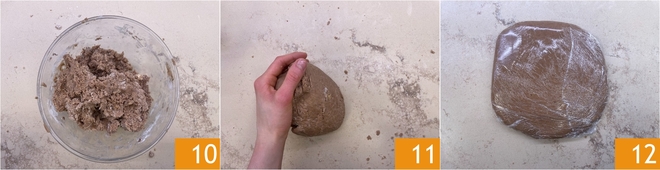 Wenn Sie eine grobe Masse erhalten haben 10, übertragen Sie sie auf die Arbeitsfläche und kneten Sie sie mit den Händen zusammen 11, dann flachen Sie sie leicht ab und wickeln Sie sie in Frischhaltefolie. Lassen Sie sie mindestens 3 Stunden im Kühlschrank ruhen 12.