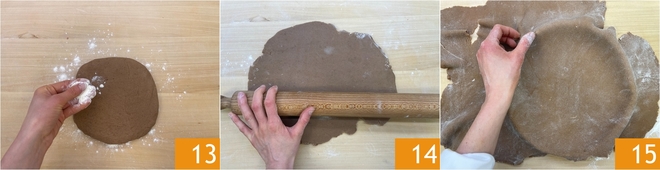 Nach der Ruhezeit nehmen Sie den Teig heraus, bestäuben Sie die Arbeitsfläche mit Mehl 13 und rollen Sie ihn mit einem Nudelholz auf eine Dicke von etwa 4-5 mm aus 14. Schneiden Sie eine Scheibe aus, die etwas größer ist als die Backform, und rollen Sie sie vorsichtig auf das Nudelholz, dann legen Sie sie in eine Tarteform mit abnehmbarem Boden von 26 cm 15.