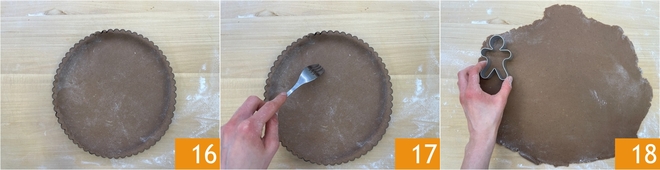 Drücken Sie den Teig gut an den Rändern fest und schneiden Sie den Überschuss ab 16. Stechen Sie den Boden mit einer Gabel ein, um zu verhindern, dass er beim Backen aufquillt 17, und backen Sie ihn im vorgeheizten statischen Ofen bei 175°C für ca. 30 Minuten auf dem unteren Rost. Nachdem er gebacken ist, nehmen Sie ihn aus dem Ofen und lassen Sie ihn abkühlen. In der Zwischenzeit rollen Sie den restlichen Mürbeteig erneut auf eine Dicke von 4-5 mm aus und schneiden Sie Lebkuchen-Männchen mit einem speziellen Ausstecher aus 18.