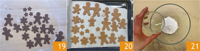Schneiden Sie auch andere Formen nach Belieben wie Schneeflocken und Sterne mit Ausstechern in verschiedenen Größen 19. Legen Sie die Kekse auf ein mit Backpapier ausgelegtes Blech 20 und backen Sie sie im statischen Ofen bei 175°C für 10-12 Minuten. Während die Kekse backen, bereiten Sie das Royal Icing vor, indem Sie Puderzucker und Eiweiß in eine Schüssel geben 21.