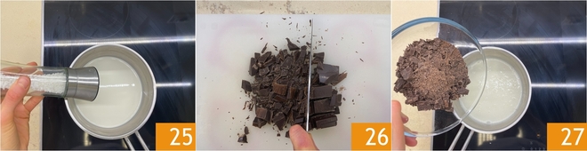 Gehen Sie zur Ganache über: Erwärmen Sie in einem Topf die Sahne mit einer Prise Salz 25. Hacken Sie die dunkle Schokolade grob 26 und geben Sie sie in die heiße Sahne, sobald sie den Siedepunkt erreicht hat 27.