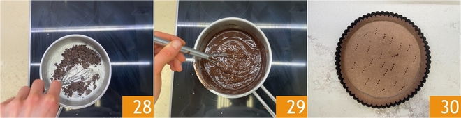 Rühren Sie mit einem Schneebesen, bis die Schokolade vollständig geschmolzen ist und die Ganache glatt und samtig ist 28. Nehmen Sie nun den abgekühlten Kuchenboden 30.