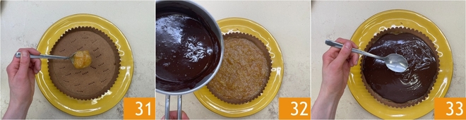 Füllen Sie die Mürbeteighülle mit der Marmelade 31 und glätten Sie sie mit einem Löffel. Gießen Sie die noch warme Ganache darüber 32, lassen Sie sie abtropfen und glätten Sie sie dann vorsichtig 33.