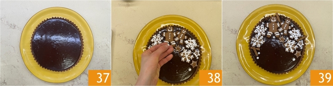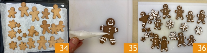 Stellen Sie die Tarte mindestens 30 Minuten in den Kühlschrank, um sie fest werden zu lassen. In der Zwischenzeit dekorieren Sie die gebackenen und abgekühlten Kekse mit dem Royal Icing, indem Sie Konturen, Knöpfe, Linien und Schleifen nach Ihrer Fantasie zeichnen 35; lassen Sie sie bei Raumtemperatur trocknen 36.