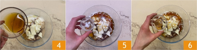 Fügen Sie auch den Honig 4, das Natron 5 und die Muskatnuss 6 hinzu.