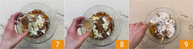 Aromatisieren Sie schließlich mit Zimt 7 und Ingwerpulver 8. Beginnen Sie, die Zutaten mit einem Löffel 9 oder dem Flachrührer der Küchenmaschine zu mischen, dann arbeiten Sie weiter mit den Fingerspitzen.