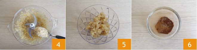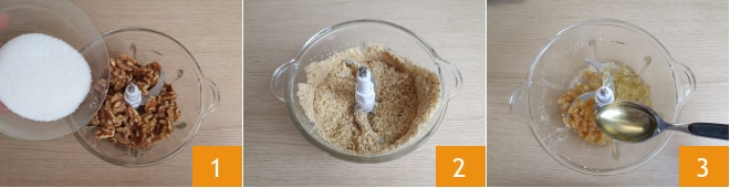 Um die Lebkuchen vorzubereiten, geben Sie die geschälten Nüsse und die Hälfte des Zuckers (80 g) in einen Mixer 1. Mixen Sie in Intervallen, um pulverisierte Nüsse zu erhalten, aber auch ein gröberer Teil 2. Gießen Sie es in eine Schüssel und stellen Sie es beiseite. Geben Sie die kandierte Orange, den kandierten Zitronat und den Honig in den Mixer 3.