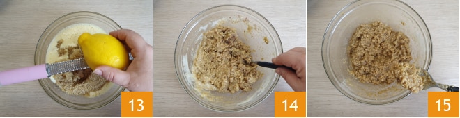 Fügen Sie auch die abgeriebene Schale von ¼ einer Zitrone hinzu 13 und vermengen Sie den Teig 14. Nehmen Sie 30 g Teig ab 15.