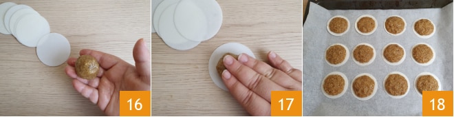 Mit leicht feuchten Händen formen Sie eine Kugel 16 und legen Sie sie in die Mitte einer Oblate mit 7 cm Durchmesser. Drücken Sie sie leicht flach 17 und formen Sie sie so, dass ein Rand von etwa 5 mm frei bleibt. Fahren Sie so fort, bis der Teig aufgebraucht ist. Legen Sie die Kekse nach und nach auf ein mit Backpapier ausgelegtes Blech 18.