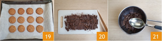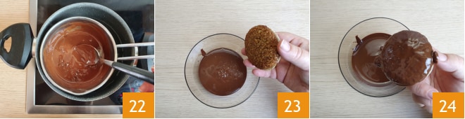 und schmelzen Sie sie im Wasserbad 22. Dann in eine kleine Schüssel umfüllen. Nehmen Sie einen Keks und tauchen Sie die Unterseite in die Schokolade 23, klopfen Sie leicht, um überschüssige Glasur ablaufen zu lassen 24