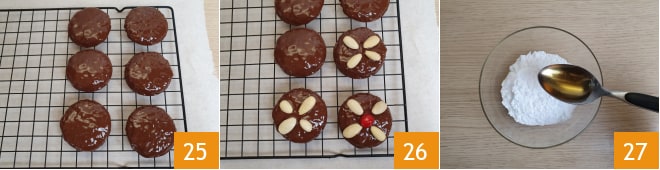 und legen Sie ihn auf ein Gitter mit der Schokoladenseite nach oben 25. Solange die Schokolade noch weich ist, können Sie die Kekse mit einer halben kandierten Kirsche und/oder einigen Mandeln dekorieren 26. Für die Version mit Punchglasur: Geben Sie Puderzucker in eine Schüssel und fügen Sie 1 Esslöffel Rum hinzu 27