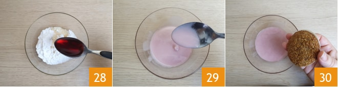 und 1 Esslöffel Rotwein 28. Kurz mischen, bis eine homogene Glasur entsteht 29. Nehmen Sie einen Lebkuchen und tauchen Sie die Unterseite in die Glasur 30,