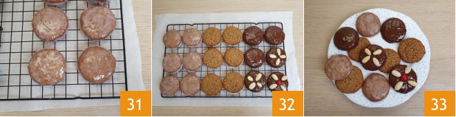 dann leicht abklopfen, um überschüssige Glasur zu entfernen und auf ein Gitter mit der Glasurseite nach oben legen 31. Lassen Sie die Kekse trocknen 32, und servieren Sie sie 33.