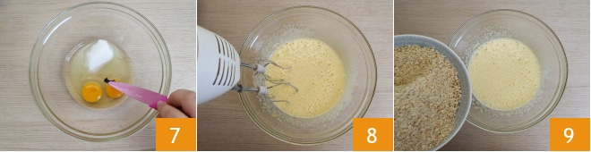 Schälen Sie zwei ganze Eier und geben Sie sie in eine Schüssel, fügen Sie den restlichen Zucker und die Samen einer halben Vanilleschote hinzu 7. Schlagen Sie mit den elektrischen Rührbesen, bis Sie eine schaumige Mischung erhalten 8. Fügen Sie die gehackten Nüsse hinzu 9,
