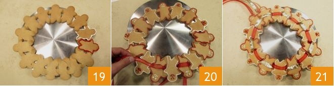 indem Sie die beiden Glasuren abwechselnd verwenden 19, fädeln Sie dann ein Band zwischen die Kekse hindurch, so dass es sichtbar ist 20, und führen Sie die gleichen Schritte auch für den anderen Lebkuchenkranz durch, sodass sie einsatzbereit sind 21.