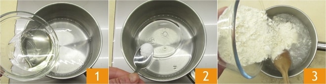Um die leckeren Churros zuzubereiten, beginnt ihr mit dem Teig: Gebt Wasser, Pflanzenöl 1 und Salz 2 in einen Topf und bringt es fast zum Kochen. In der Zwischenzeit das Mehl separat sieben. Sobald das Wasser fast kocht, nehmt den Topf vom Herd und fügt das Mehl auf einmal hinzu 3.
