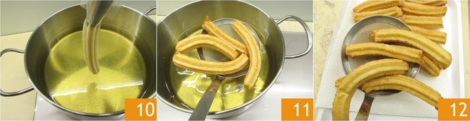 Erhitzt das Pflanzenöl in einem großen Topf auf 180°C, dann drückt den Teig direkt in das Öl und schneidet ihn mit einem Messer auf eine Länge von etwa 10 cm 10. Frittiert die Churros für etwa 3-5 Minuten, dreht sie oft, damit sie gleichmäßig von allen Seiten goldbraun werden, dann abtropfen lassen 11 und auf Küchenpapier legen, um überschüssiges Öl zu entfernen 12.