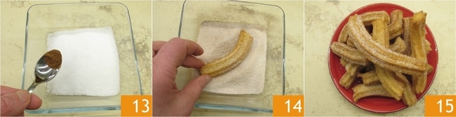 In der Zwischenzeit den Kristallzucker mit Zimt (wenn gewünscht) mischen 13. Wendet die noch warmen leckeren Churros im aromatisierten Zucker und bedeckt sie vollständig 14. Eure leckeren Churros sind bereit, zusammen mit einer Tasse heißer Schokolade genossen zu werden 15!