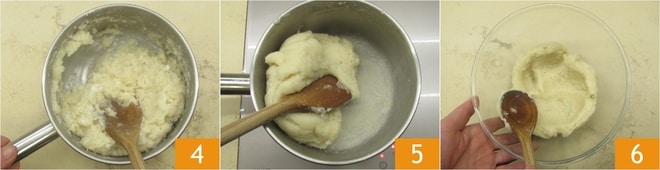 Rührt kräftig mit einem Holzlöffel, um eine feste und konsistente Masse zu erhalten 4, dann stellt den Topf zurück auf den Herd und rührt mindestens 3 Minuten bei mittlerer Hitze, bis sich ein weißer Film am Boden bildet 5. Gebt die Mischung in eine Schüssel und verteilt sie mit dem Holzlöffel an den Rändern, damit sie schneller abkühlt 6. Lasst sie 10 Minuten abkühlen.