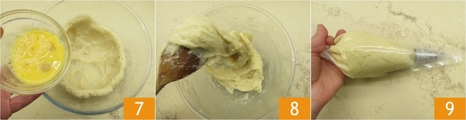 Wenn die Masse abgekühlt ist, gebt das zuvor geschlagene Ei hinzu 7 und rührt kräftig, um es zu integrieren, bis der Teig glatt, kompakt und homogen ist 8. Gebt den Teig in einen Spritzbeutel mit mittlerer Sterndüse (wir haben eine mit 15 mm verwendet) 9.