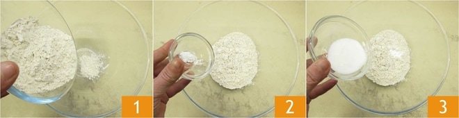 Um die leckeren Kastanienpfannkuchen zuzubereiten, bereiten Sie zuerst den Teig vor: Geben Sie das Kastanienmehl in eine Schüssel 1 zusammen mit dem Backpulver 2 und dem Zucker 3.