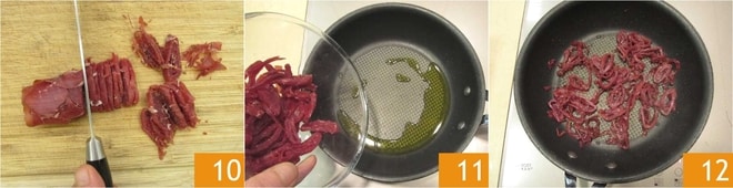 Schneiden Sie den Bresaola in Streifen von etwa einem halben cm Dicke 10. Erhitzen Sie einen Schuss Öl in einer Pfanne, geben Sie den Bresaola hinzu 11 und braten Sie ihn bei starker Hitze 3-4 Minuten an 12. Legen Sie auch den knusprigen Bresaola auf Küchentuchpapier, um das überschüssige Öl aufzusaugen, und stellen Sie ihn beiseite.