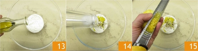 Geben Sie nun den Ricotta in eine Schüssel, salzen 14, pfeffern und fügen Sie die geriebene Zitronenschale hinzu 15, dann rühren Sie, um alles zu vermischen.