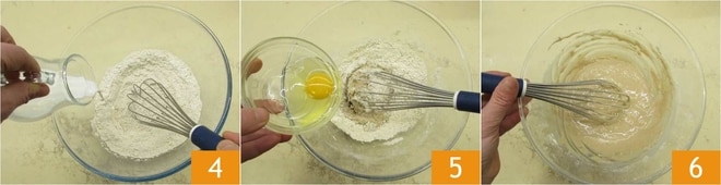 Gießen Sie die Milch nach und nach ein, während Sie mit einem Schneebesen rühren, um Klumpenbildung zu vermeiden 4, dann fügen Sie auch das Ei 5, das Salz und den Pfeffer hinzu. Sie sollten eine glatte und homogene Masse erhalten 6.