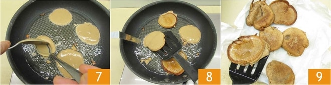 Erhitzen Sie das Pflanzenöl in einer Pfanne auf eine Temperatur von 170°C, dann geben Sie jeweils einen Löffel Teig hinein, indem Sie sich mit 2 Löffeln helfen, um ihn gleiten zu lassen 7. Braten Sie die Pfannkuchen 2 Minuten pro Seite 8, dann lassen Sie sie auf saugfähigem Papier abtropfen, um das überschüssige Öl zu entfernen 9.