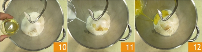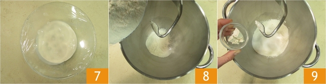 Lassen Sie es bei einer Temperatur von etwa 30° für 2 Stunden reifen: ausgeschalteter Ofen mit eingeschaltetem Licht funktioniert gut 7. Wenn der Lievitino sein Volumen verdoppelt hat, geben Sie das Mehl in die Schüssel einer Küchenmaschine mit Knethaken 8, fügen Sie die zerbröckelte Hefe hinzu 9.