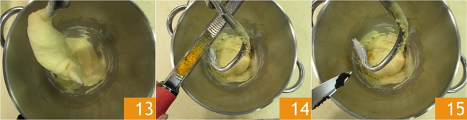 Arbeiten Sie die Mischung, bis sie gut verbunden ist 13. Fügen Sie die abgeriebene Orangenschale hinzu, achten Sie darauf, nur den orangefarbenen Teil zu nehmen 14 und die Samen einer Vanilleschote 15.