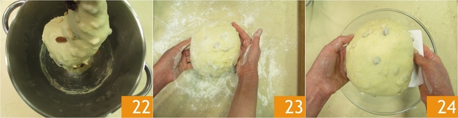 Kneten Sie weiter, bis alles gut vermischt ist 22. Übertragen Sie den Teig auf eine Arbeitsfläche 23, formen Sie ihn zu einer Kugel und legen Sie ihn in eine Schüssel 24.
