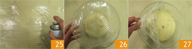 Ölen Sie ein Stück Frischhaltefolie leicht ein 25 und verwenden Sie es, um die Schüssel abzudichten 26. Lassen Sie es 2 Stunden bei Raumtemperatur gehen, dann über Nacht im Kühlschrank. Am nächsten Tag entfernen Sie die Frischhaltefolie 27.