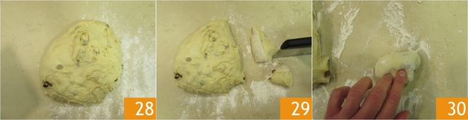 und übertragen Sie den Teig auf die bemehlte Arbeitsfläche 28. Verwenden Sie eine Teigkarte, um 20 etwa 50 g schwere Stücke zu schneiden 29. Machen Sie schnelle Faltungen 30,