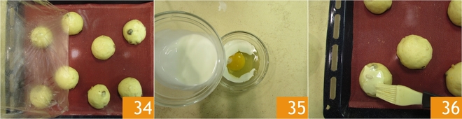 Entfernen Sie dann vorsichtig die Folie 34. Geben Sie gleiche Mengen Sahne und Eier in eine kleine Schüssel 35, schlagen Sie sie und verwenden Sie sie, um die Maritozzi zu bestreichen 36.