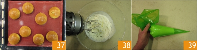Backen Sie sie im vorgeheizten statischen Ofen bei 190° für 7-8 Minuten 37, dann nehmen Sie sie heraus und lassen Sie sie abkühlen. Schlagen Sie die Sahne (ohne Zucker hinzuzufügen) 38 und füllen Sie sie in einen Spritzbeutel 39.
